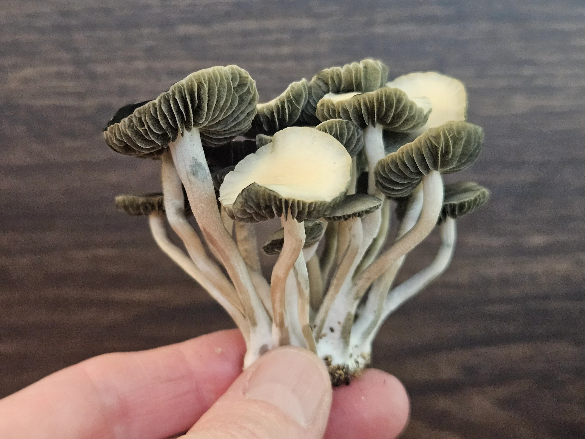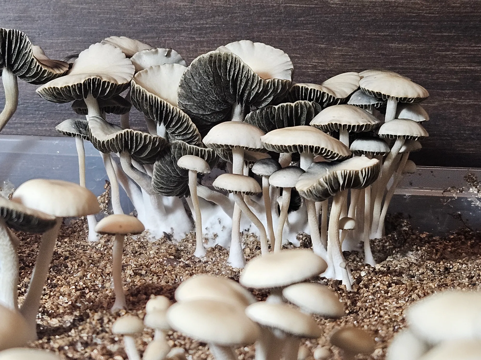 This isolation stands out from any Panaeolus cyanescens I’ve seen before. Typically, pan cyans don’t start to flatten their caps until maturity, it’s one of the key signs they’re ready for harvest. Texas Titans, however, flatten their caps as pins and keep them flat while continuing to grow upwards. Once they’ve finished growing vertically, the caps start to ruffle for several days as spores develop and then flip. They’re very pretty, about average in height, have a healthy thickness to them and often grow in clusters.